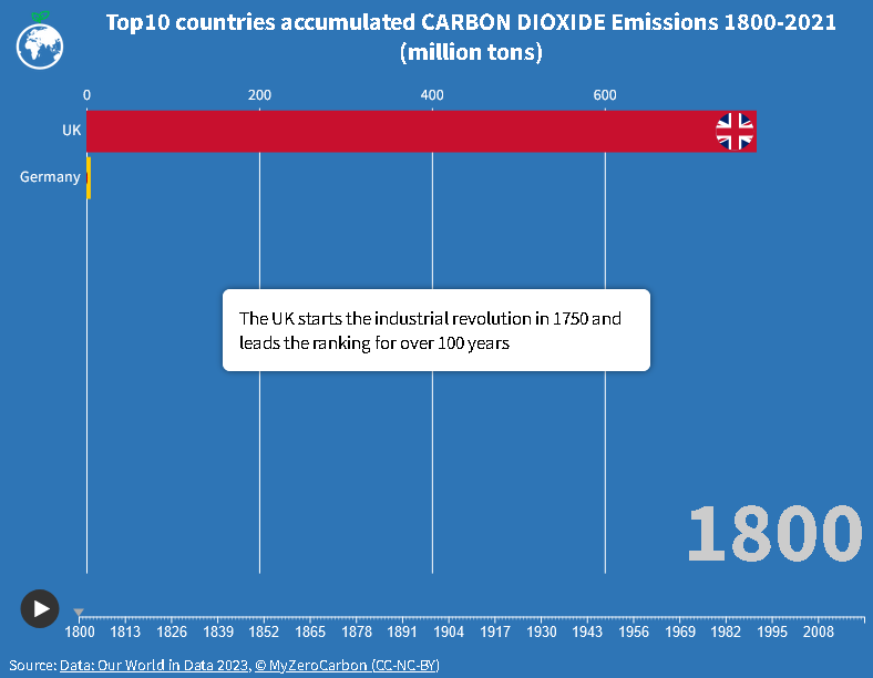 In the visualisation below you can see how countries have accumulated their carbon emissions since 1800.